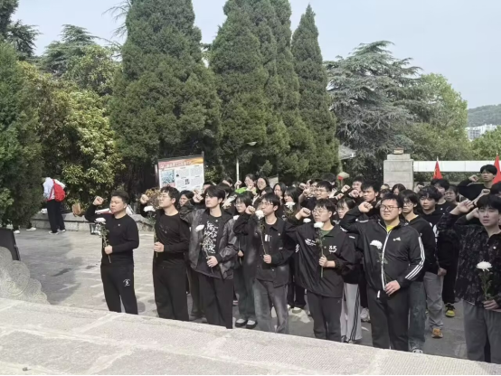 岳耀闯老师寄语全体同学,革命先烈用鲜血和生命铸就了今日的和平盛世,勉励同学们铭记历史、不忘初心,将爱国情、强国志切实转化为报国之行。随后,学生代表李俊带领全体同学高举右拳,庄严宣誓。铿锵有力的誓言在陵园上空回荡,传递着同学们继承先烈遗志、勇担时代责任的坚定决心。